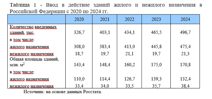 За период с 2020 по 2024 год в России наблюдалась устойчивая положительная динамика объемов строительства. Общее количество вводимых в эксплуатацию зданий росло каждый год, увеличившись с 326,7 тысяч в 2020 году до 496,7 тысяч в 2024 году. Практически весь этот рост (около 95-96%) обеспечивался за счет зданий жилого назначения. Однако в 2024 году наметились важные структурные изменения - общая площадь введенных объектов впервые за пять лет сократилась — с рекордных 175,0 млн м² в 2023 году до 170,8 млн м² в 2024 году. Согласно данным Росстата (таблица 1) данное снижение произошло исключительно за счет жилого сектора, где общая площадь уменьшилась на 4,9%, но нежилого назначения - увеличивается на 5 млн. м2
