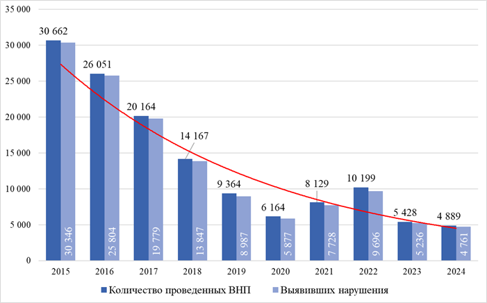 Согласно статистике за последние 10 лет количество ВНП сократилось почти в 6,5 раз. В частности, в 2024 г. количество выездных проверок снизилось на 9,9 % по сравнению с 2023 г. и на 84,05 % по сравнению с 2015 г. Увеличение количества ВНП в 2021–2022 гг. обусловлено завершением ранее начатых проверок, в том числе приостановленных ввиду эпидемиологической ситуации в мире в 2020 г.