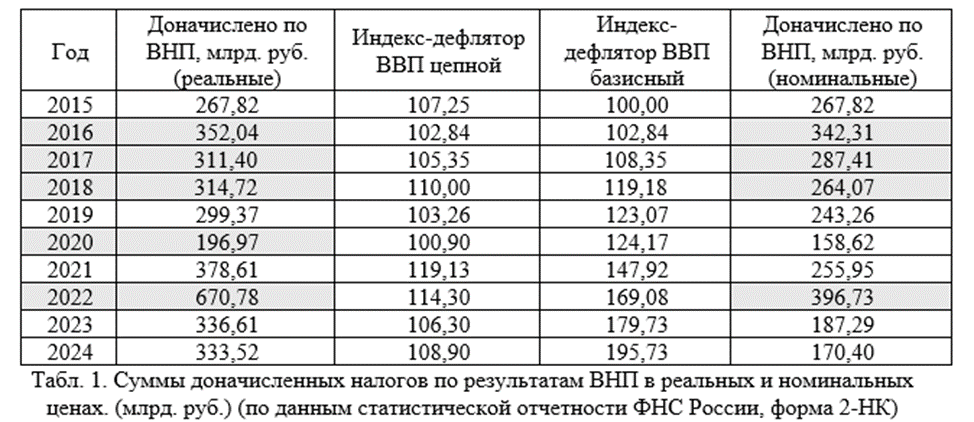 Динамика сумм доначисленных налогов по результатам ВНП в 2015 -2024 гг. в реальных и номинальных ценах с учетом индекса-дефлятора ВВП показана в таблице 1.