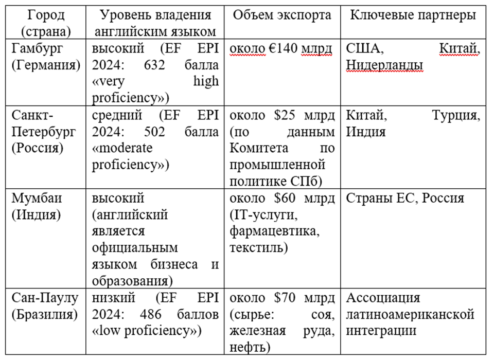 Хотя большинство макроэкономических исследований фокусируются на странах, городской уровень также позволяет увидеть более тонкие эффекты – особенно в многоязычных или экспортно-ориентированных регионах. Ниже приведены примеры на основе данных Всемирного банка, ВТО, Eurostat, а также исследований EF English Proficiency Index (EF EPI) и Организации экономического сотрудничества и развития (OECD).