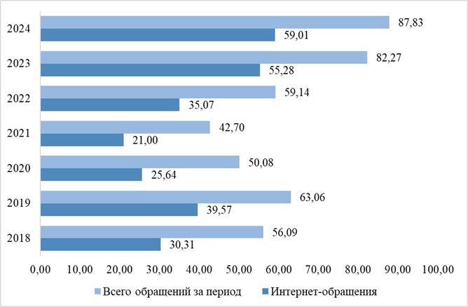Рисунок 1 показывает явный рост числа интернет-обращений, что свидетельствует об увеличении популярности онлайн-каналов. Однако, еще существует потенциал для дальнейшего увеличения доли онлайн-коммуникаций, поскольку и другие каналы коммуникации (например, телефон, личные визиты) все еще играют значительную роль.