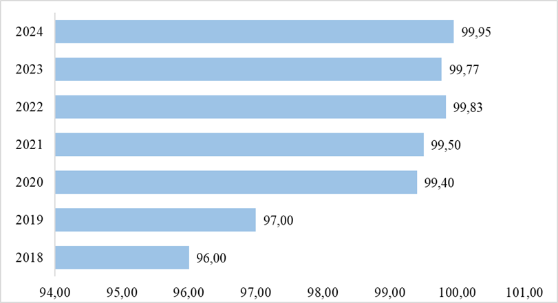 Анализ данных позволяет утверждать о стабильном повышении степени удовлетворенности населения качеством услуг, предоставляемых налоговой службой. Так, начиная с 2020 г. наблюдается достижение показателем отметки в 99,4% и дальнейший его рост в последующие годы. В 2024 г. был достигнут рекордно высокий показатель на уровне 99,95%.