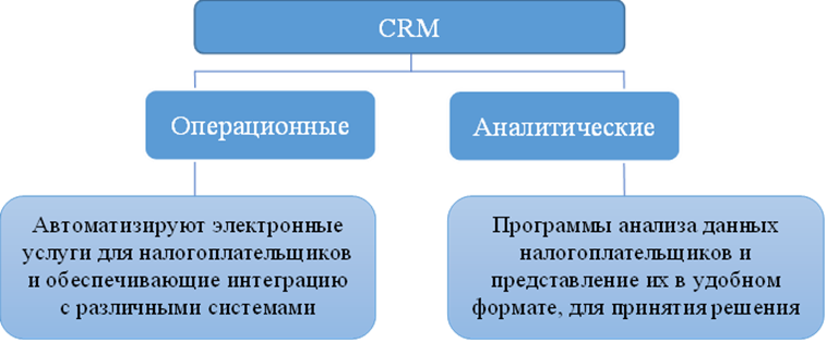 С развитием информационных технологий появились системы, позволяющие оптимизировать отношения налоговых органов с налогоплательщиками, известные как CRM-системы («управление взаимоотношениями с клиентами», англ. Customer Relationship Management), основные их виды представлены на рисунке 3. Они упрощают управление контактами через различные каналы коммуникации. Каждый из множества подобных инструментов, позволяет моделировать взаимодействие между участниками налоговых отношений.