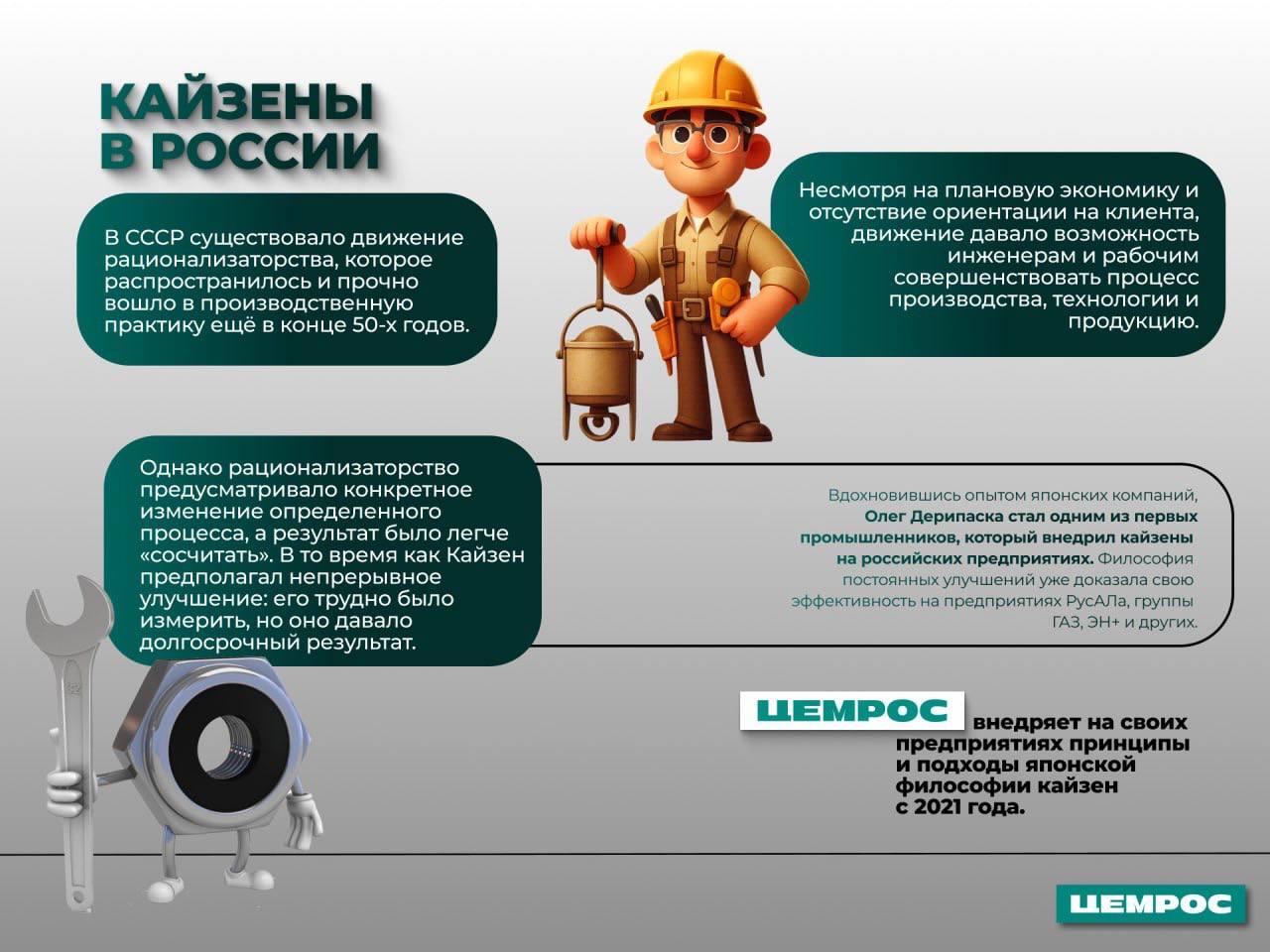 ЦЕМРОС с 2021 года внедряет на всех активах философию кайзен (от яп. Kai — изменение, Zen — хорошо) — систему непрерывных улучшений, где каждый сотрудник может стать автором изменений.