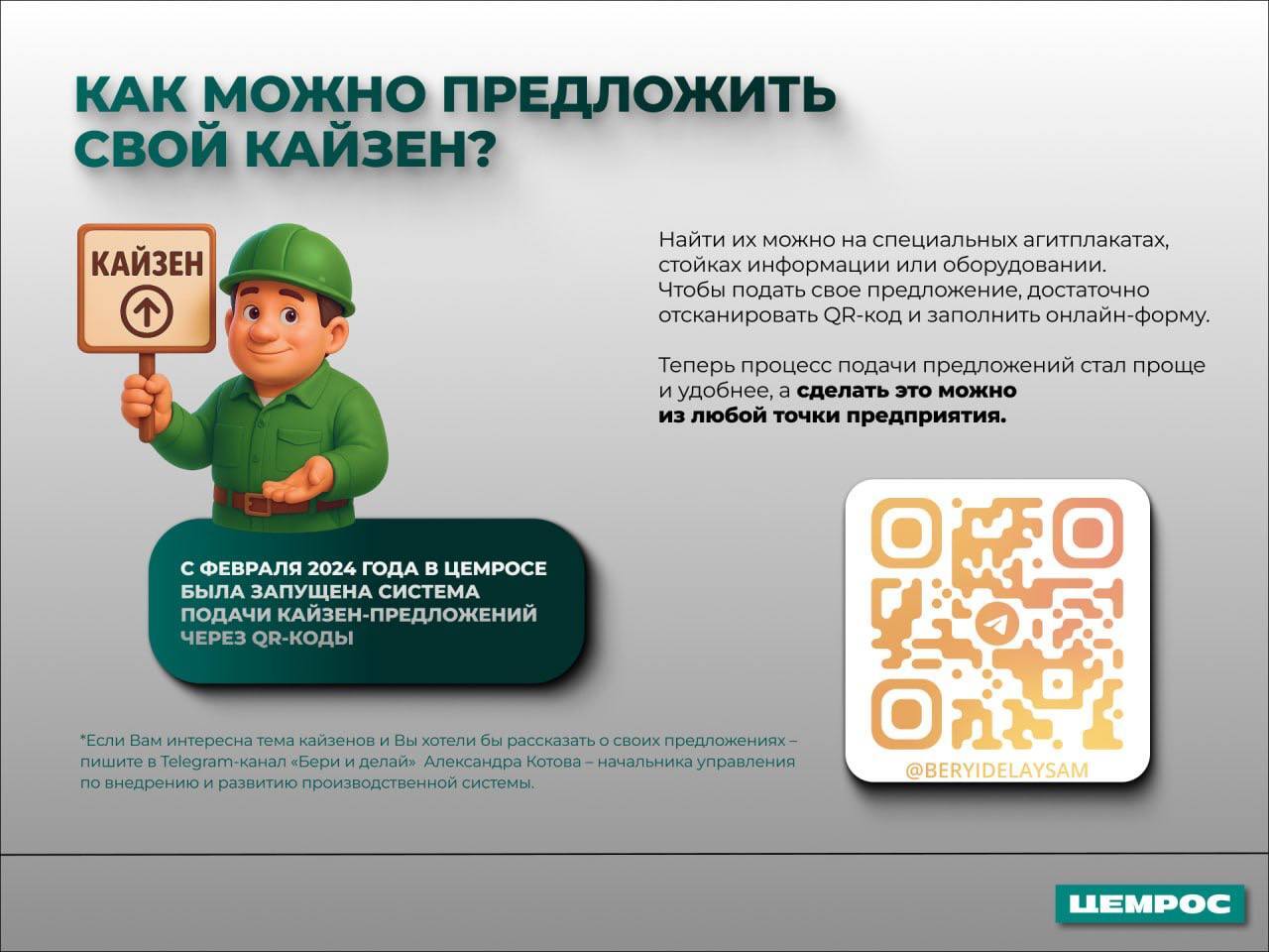 В ЦЕМРОСе подать кайзен-предложение может любой сотрудник. Для этого достаточно заполнить специальный бланк или воспользоваться цифровой формой — с февраля 2024 года компания запустила систему подачи кайзенов через QR-коды, сделав процесс максимально простым и удобным.