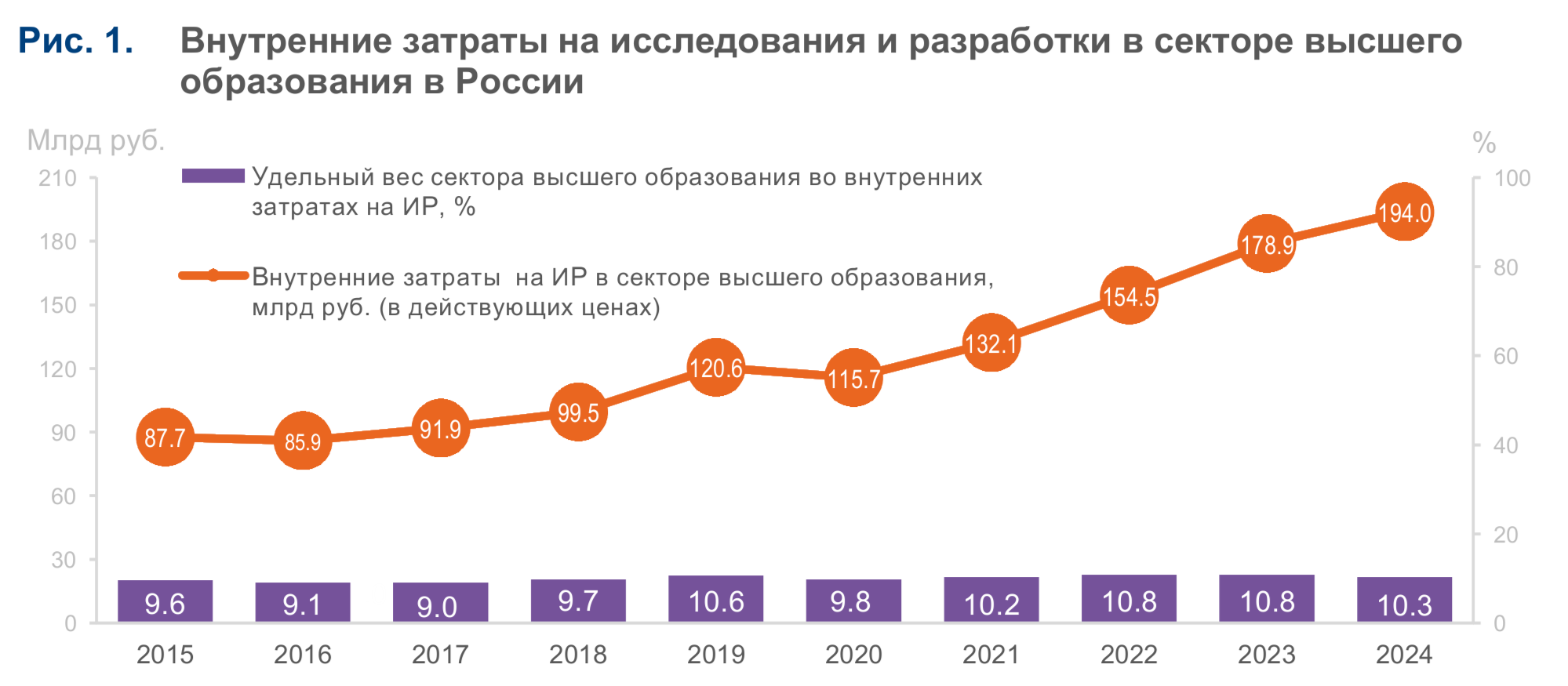 Объем внутренних затрат на ИР в секторе высшего образования в 2024 г. достиг 194 млрд руб., увеличившись за год на 15,1 млрд руб. На организации вузовского сектора (как исполнителей ИР) приходится десятая часть всех затрат на науку в стране (10,3%) (рис. 1). Эта величина сопоставима с аналогичным показателем в США (10,7%), Японии (11,1%) и Китае (8,3%), но заметно ниже средней по странам ОЭСР (15,8%) и ЕС-27 (21,6%).