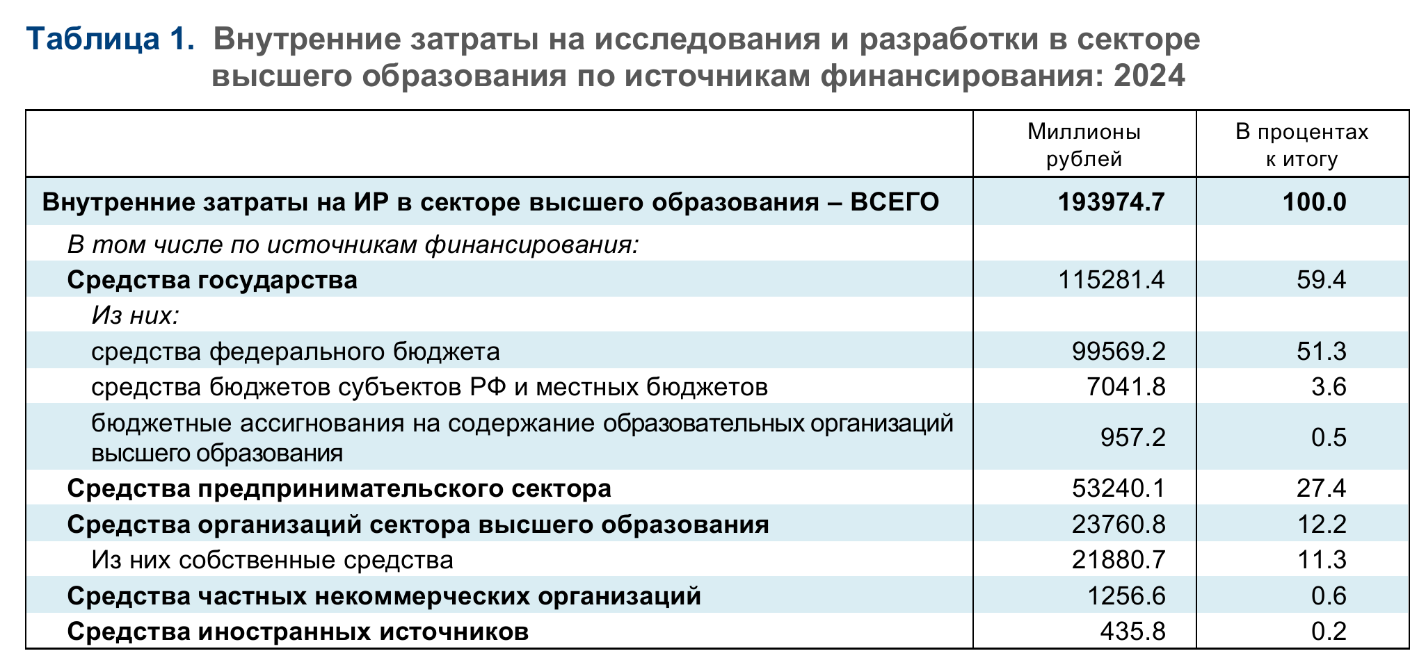 Основным источником финансирования ИР в российском секторе высшего образования (как и в науке в целом) являются средства государства — 59,4% в 2024 г. (в частности, федерального бюджета — 51,3%). Свыше четверти затрат (27,4%) обеспечены инвестициями бизнеса, 12.2% приходятся на средства организаций сектора высшего образования, включая собственные (табл. 1). В других секторах науки структура затрат по источникам заметно отличается: в государственном — выше вклад средств государства (90,5%), на долю бизнеса приходится 8,8%, на остальные источники — менее 1%; в предпринимательском секторе аналогичные показатели составили 52,7, 45,8 и 1,6% соответственно.