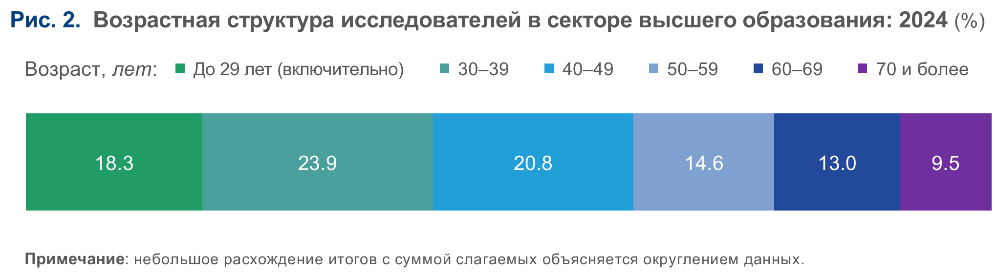 По данным 2024 г., каждый десятый работник, занятый ИР, трудится в организациях сектора высшего образования — 70,3 тыс. чел.; из них 45,2 тыс. — исследователи, 9 тыс. — техники, 16,1 тыс. — вспомогательный и прочий персонал. Кадровый потенциал вузовского сектора имеет ряд заметных особенностей. Его отличает, во-первых, высокий уровень образования работников: максимальная доля лиц с высшим образованием — 89,2% (против 76,6% в госсекторе и 75,2% в предпринимательском). Во-вторых — наибольший удельный вес исследователей — 64,4% (против 48,5% в государственном и предпринимательском секторах). В-третьих, более половины исследователей здесь (56,4%) имеют ученую степень кандидата или доктора наук, что связано с требованиями к квалификации работников. Для сравнения: в госсекторе ученую степень имеют 43,9% исследователей, а в предпринимательском — 7%. И, наконец, сектор высшего образования отличает довольно высокая доля исследователей младше 30 лет (18,3% против 13,2% в госсекторе и 18,1% в предпринимательском). Безусловно, влияние оказывает доступ к молодежи благодаря привлечению студентов и выпускников (рис. 2).