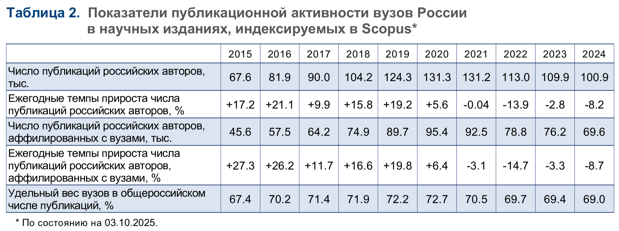 В 2022–2024 гг. на фоне обострения геополитической обстановки участие российских ученых в ряде международных научных проектов было затруднено либо вовсе приостановлено, а возможности публиковать свои работы в зарубежных научных изданиях сократились. С учетом этих изменений Правительством РФ было принято решение о введении временного (на 2022 г., а затем продленного на 2023–2024 гг.) моратория4 на использование показателей публикационной активности при оценке результативности и эффективности деятельности бюджетных и автономных учреждений, научных, научно-технических и инновационных программ и проектов, программ поддержки высшего образования. В результате в 2024 г. общее число публикаций России сократилось на 23,1% к уровню 2020 г. В вузовском секторе снижение составило 27%.