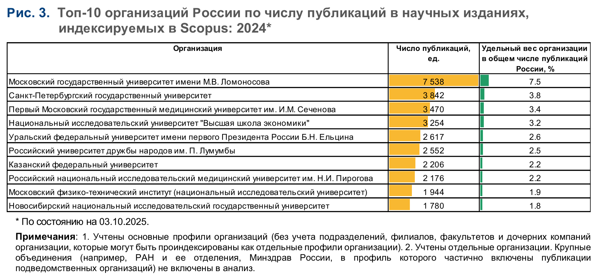 Несмотря на такую динамику, вклад вузовского сектора в массив научных публикаций страны практически не изменился и сохраняется на уровне 70% (69% в 2024 г.). В рейтинге российских организаций по уровню публикационной активности вузы в 2024 г. заняли все позиции первой десятки (рис. 3), впрочем, как и в 2015 г.
