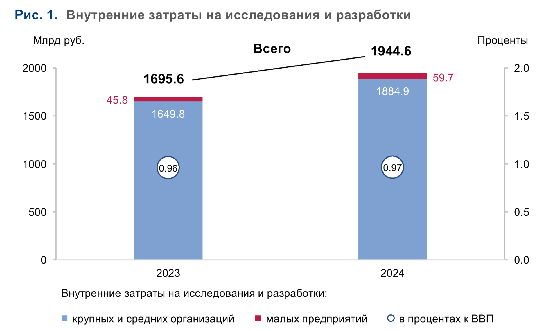 Суммарный объем внутренних затрат на ИР (с учетом малых предприятий) в 2024 г. составил 1,94 трлн руб., или 0,97% ВВП (рис. 1). По сравнению с предыдущим годом абсолютная величина затрат на науку увеличилась на 249 млрд руб. в действующих ценах, или на 4,9% в пересчете в постоянные цены. Основной вклад в развитие ИР (96,9%) вносят крупные и средние организации.