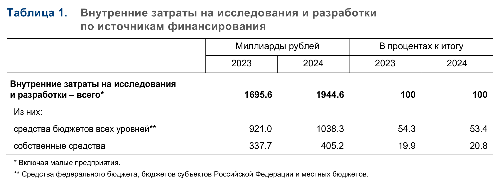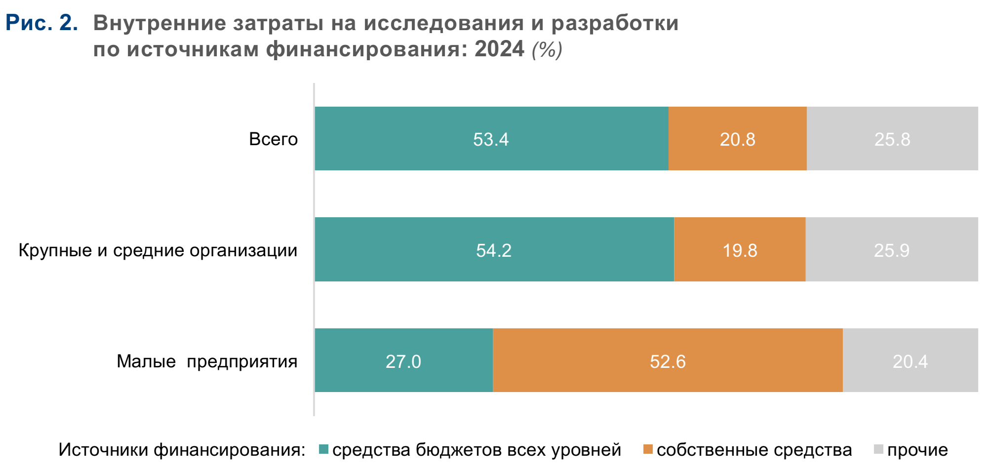 Более половины внутренних затрат на ИР (53,4% в 2024 г.) финансировались из средств бюджетов всех уровней и пятая часть (20,8%) — за счет собственных средств организаций (табл. 1).
