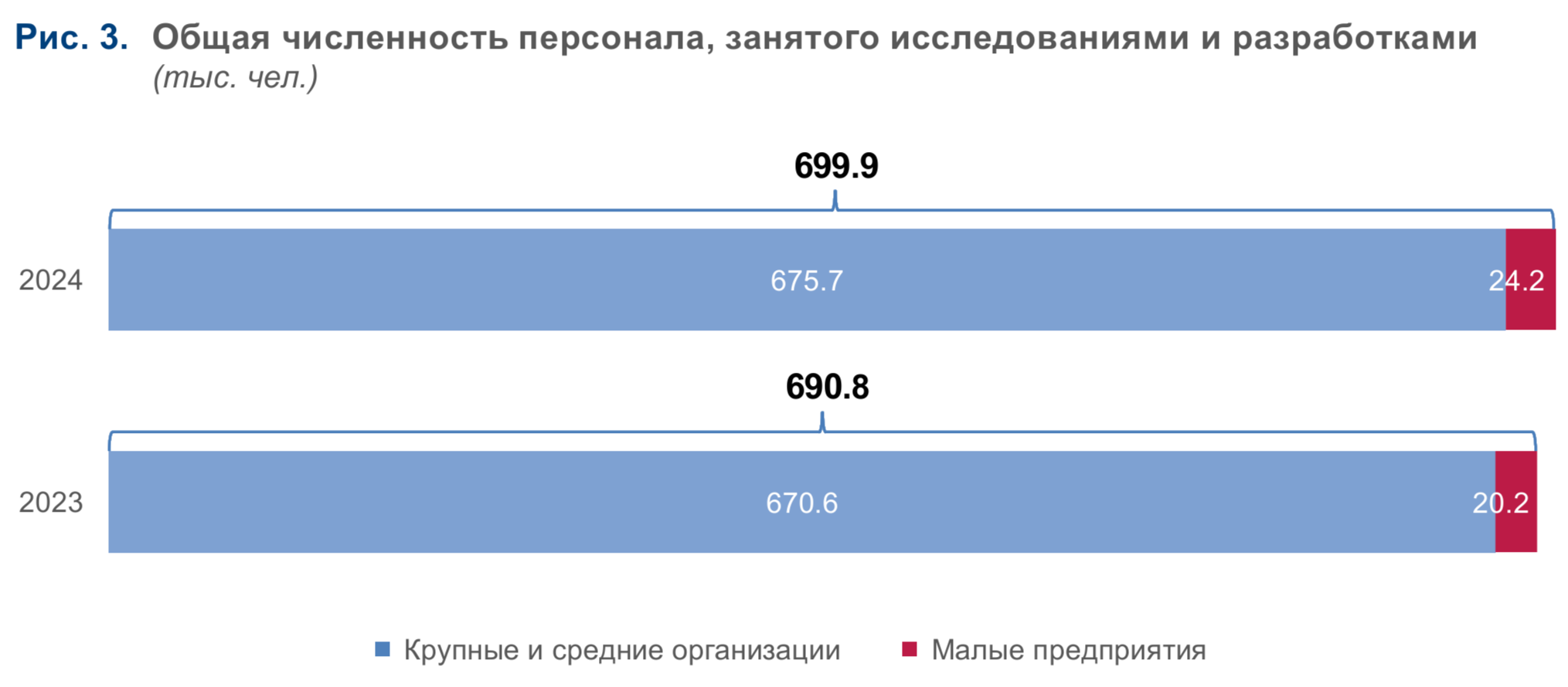 Общая численность персонала, занятого ИР в стране, к концу 2024 г. составила 699,9 тыс. чел., преимущественно это сотрудники крупных и средних организаций (96,5%), 3,5% — малых предприятий (рис. 3). По сравнению с 2023 г. общая численность занятых в науке увеличилась на 1,3% (+9,1 тыс. чел.): в крупных и средних организациях — на 5,1 тыс. чел. (+0,8%), в малых предприятиях — на 4,1 тыс. чел. (+20,1%).