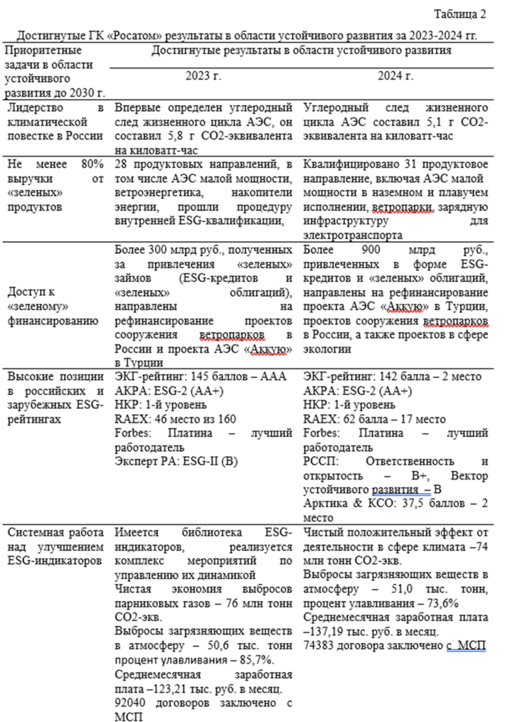 Исследование корпоративной отчетности коммерческих экономических субъектов государственного сектора показало приверженность многих их них современной тенденции ESG-трансформации. В частности, Госкорпорация «Росатом» включила ESG-повестку в свою стратегию деятельности на период до 2030 года (табл. 1), ежегодно информируя о прогрессе в достижении приоритетных задач (табл. 2).