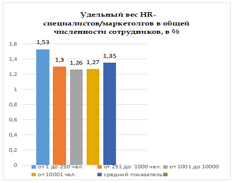 По результатам данных, полученных в ходе опросов, проведённых на платформе Headhunter, а также руководствуясь данными РОССТАТА, были выявлены средние значения численности HR-специалистов, в том числе HR-маркетологов, в зависимости от масштабов бизнеса. Наименьшая доля HR-специалистов/маркетологов у крупных предприятий с общей численностью, работающих от 1000 до 10 000 человек - 1,26%. Среди малого и среднего предпринимательства этот показатель составляет 1,53%.