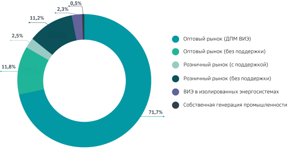 К началу 2025 года в России было введено 6,52 ГВт мощностей ВИЭ, которые почти поровну распределены между ветровой (2,57 ГВт) и солнечной (2,55 ГВт) генерацией, а также малой гидроэнергетикой (1,3 ГВт) (рисунок 3).