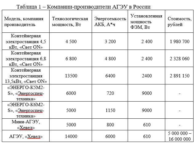 На российском рынке представлено 3 компании, которые производят и продают АГЭУ, а именно «Хевел», «Свет ON», МНПО «Энергоспецтехника» (таблица 1).