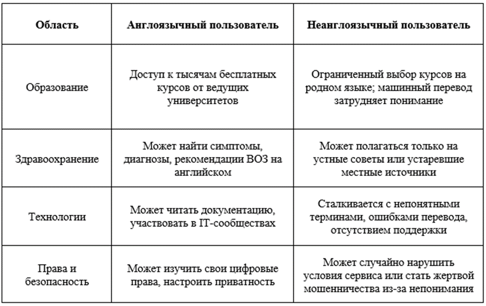 Приведенные примеры показывают, что в образовании англоязычные пользователи имеют практически неограниченный доступ к бесплатным образовательным ресурсам мировых вузов и платформ, которые предлагают тысячи высококачественных курсов. Напротив, не владеющие английским языком ограничены выбором учебных материалов на своем родном языке либо вынуждены пользоваться некачественными автоматизированными переводчиками, что значительно снижает эффективность усвоения материала.