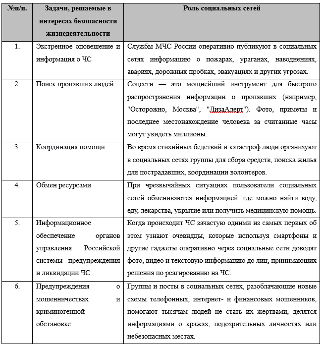 В таблице, представленной ниже отражены основные возможности социальных сетей для решения задач безопасности жизнедеятельности человека.