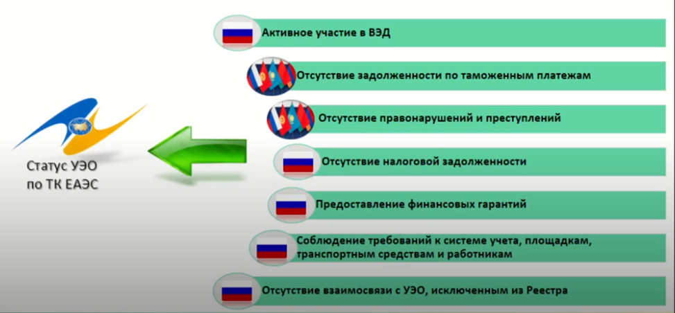 Как известно, ряд этих условий проверяются сразу во всех государствах членах Евразийского Экономического Союза, поскольку статус оператора закреплен Таможенным кодексом ЕАЭС.