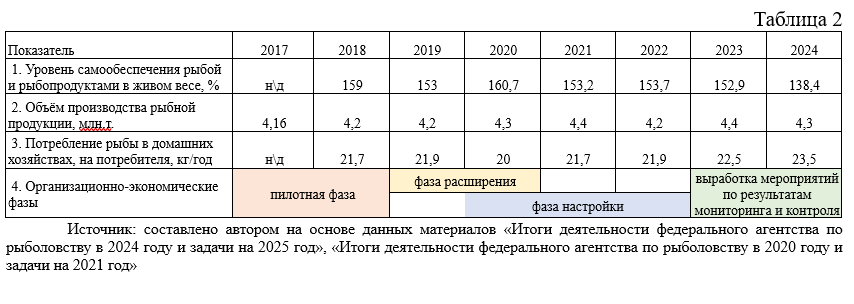 Сопоставив динамику показателя «Потребление рыбы в домашних хозяйствах, на потребителя» с организационно-экономическими фазами программы государственной поддержки, можно говорить о том, что на этапе фазы «расширения» происходила адаптация рыбной промышленности к новым условиям применения инвестиционных квот. В дальнейшем, фаза «настройки» позволила выйти на качественно новый уровень и обеспечить устойчивый рост потребления рыбы домашними хозяйствами.