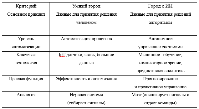 Сравнительный анализ ключевых аспектов умного города и города с искусственным интеллектом представлен в таблице ниже.