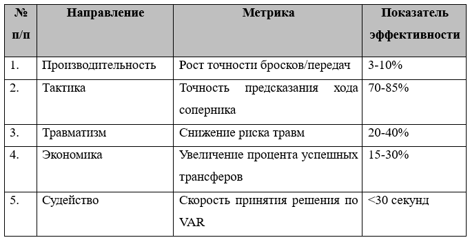 Таким образом, исходя из вышеизложенного можно сделать вывод, что искусственный интеллект в спорте — это не мода, а мощный инструмент, дающий измеряемое преимущество в росте ключевых показателей, связанных со скоростью и точностью принимаемых решений, снижению травматизма спортсменов и роста экономических показателей.