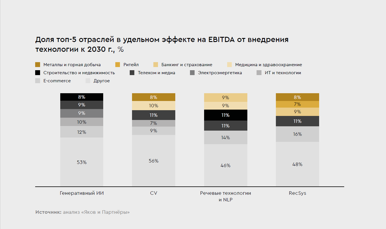 Согласно отчету, более 60% совокупного экономического эффекта в России сосредоточено в пяти ключевых отраслях: e-commerce, телеком и медиа, ИТ и технологии, строительство и недвижимость, а также медицина и здравоохранение. К 2030 г. внедрение ИИ станет вопросом выживания для большинства компаний, уверены авторы исследования. Распределение совокупного эффекта демонстрирует, что максимальную отдачу от инвестиций в ИИ получат те отрасли, где технологии оказывают непосредственное влияние на ключевые бизнес-процессы и модели монетизации.