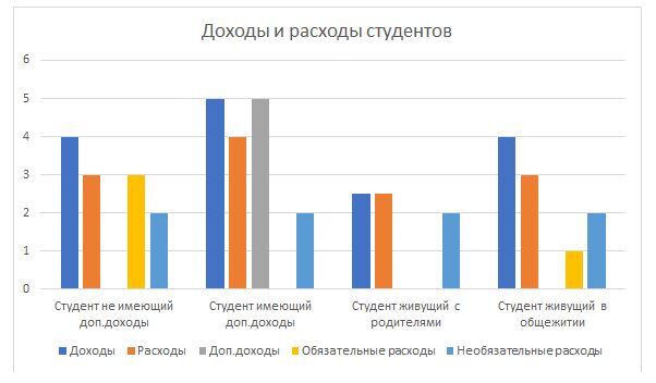 Отталкиваясь от диаграммы, можно сделать следующий вывод: обязательные расходы студента, живущего в общежитии и студента, живущего с родителями, будут сильно различаться, так как студенту, живущему с родителями, не надо платить аренду за общежитие. Также стоит отметить, что показатели диаграммы могут варьироваться и составлены примерно, дабы показать различие студентов разных сегментов. Так же в сегменты студентов можно отнести студентов на платной и бюджетной основе обучения. Там, конечно, затраты будут разных объемов. Ещё следует учитывать тот факт, что студенты, обучающиеся на очной основе и закрывающие сессии на «отлично» будут иметь дополнительной доход в лице повышенной стипендии.