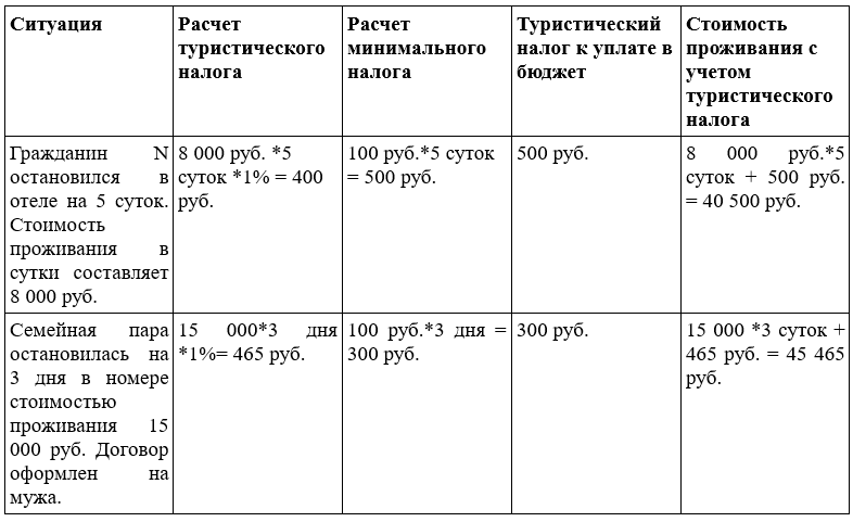 По туристическому налогу законодательством предусмотрен минимальный налог, размер которого составляет 100 руб. за сутки проживания (статья 418.7 НК РФ). Минимальный налог уплачивается в следующем случае. Если исчисленная сумма туристического налога окажется меньше суммы минимального налога, то налогоплательщику следует заплатить минимальный налог, величина которого будет включена в стоимость проживания.