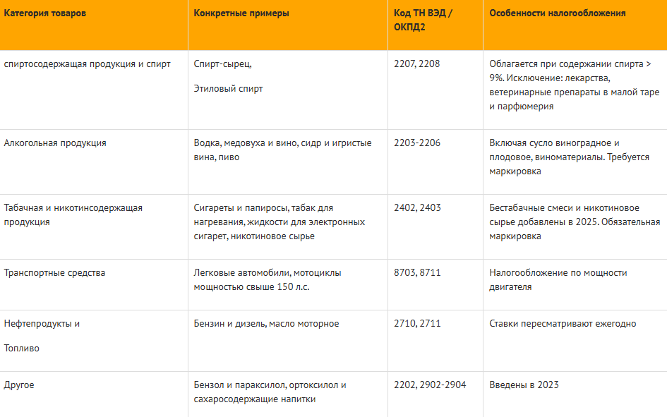 Это этиловый спирт, спиртосодержащая алкогольная продукция, табак и табачные изделия, легковые автомобили, мотоциклы, автомобильный бензин, авиационный керосин, дизельное топливо.