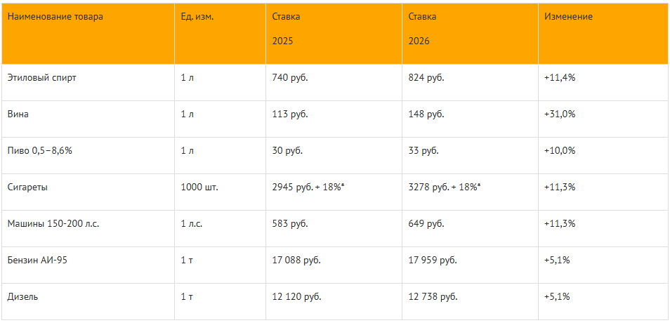 Закон № 425-ФЗ предусматривает повышение акцизных ставок с 2026 года на многие товары по утвержденному перечню товаров. При этом они будут выше тех значений, которые были установлены на 2026 год ранее (ст. 193 НК РФ). Данные изменения отображены на рисунке 1.