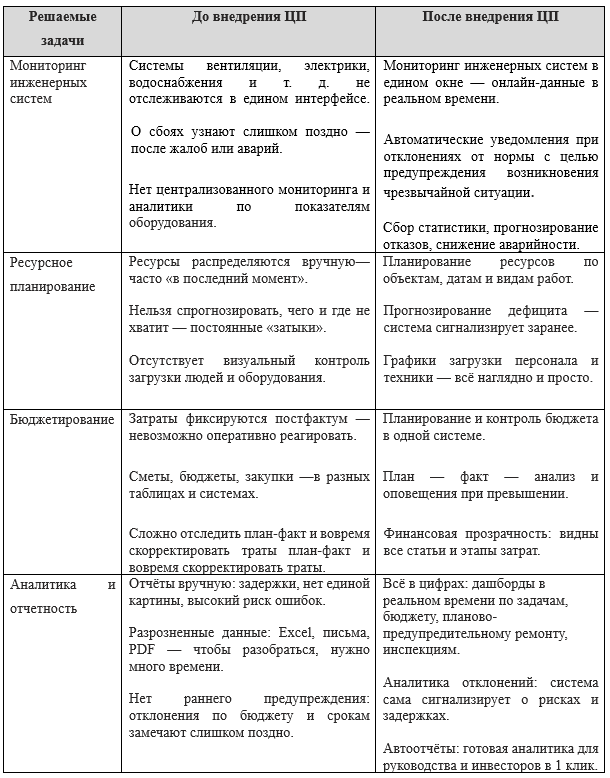 Анализ опыта внедрения цифровых платформ на ряде коммерческих объектов недвижимости свидетельствует, что для объекта общей площадью 80 000 м² и среднестатистическим составом службы эксплуатации 40 человек, общая экономия трудозатрат в результате внедрения цифровой платформы составляет около 25 млн.руб. в год.