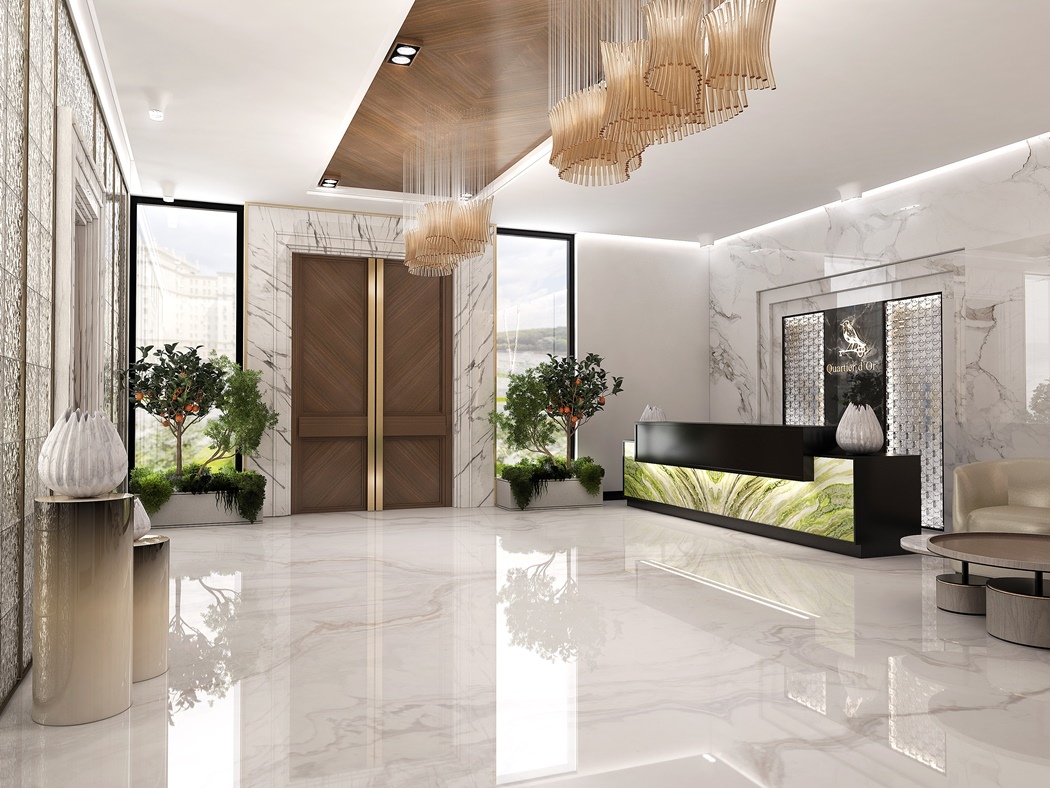 Лаундж-зоны, лифтовые холлы и лобби клубного дома делюкс-класса Quartier d’Or / «Золотой квартал» от девелопера Rariteco напоминают шкатулку с драгоценными камнями. В их отделке используется более 20 разновидностей эксклюзивного мрамора из разных уголков мира. Разнообразие оттенков впечатляет: от королевского бежевого и аристократичного кофейного до эксклюзивного серебристого и бархатистого малахитового. Натуральные материалы, живые растения, роскошные светильники и авторский декор с природными мотивами, а также мебель от именитых европейских дизайнеров помогают создать эффектные и модные общественные интерьеры в духе неоклассики.
