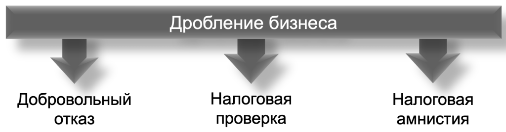 В налоговой практике присутствует множество «схем» искусственного дробления, имеющих разную сложность и продолжительность функционирования, однако причины, по которым схемы прекращают существование, всегда одинаковы (рис. 1).