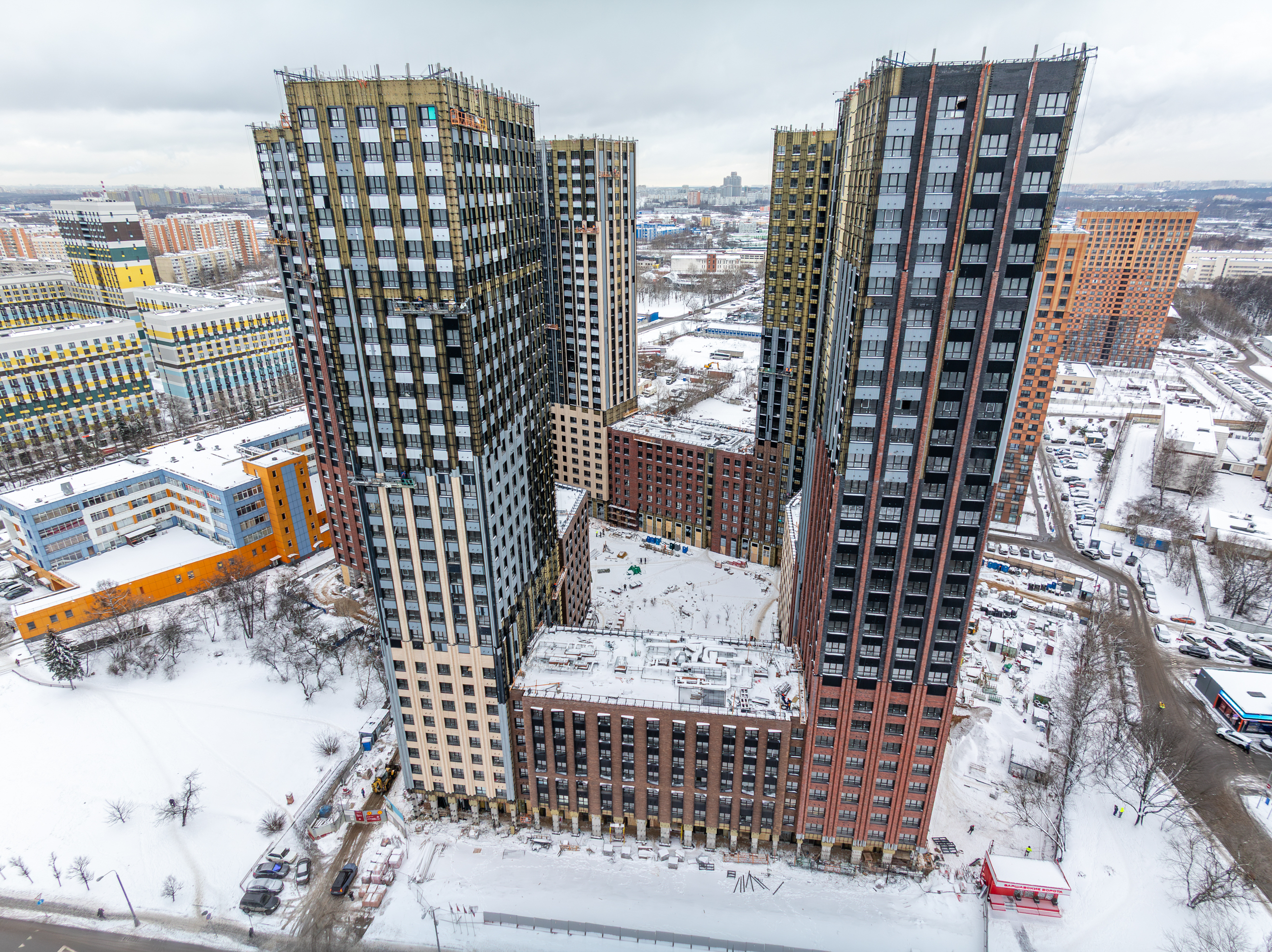Работы на кровле близки к завершению. В настоящее время выполняются примыкания к вертикальным конструкциям на высотных секциях, все остальные кровельные этапы выполнены в полном объёме. Значительная часть фасадных работ уже завершена, архитектурный облик комплекса приобретает законченный вид.
