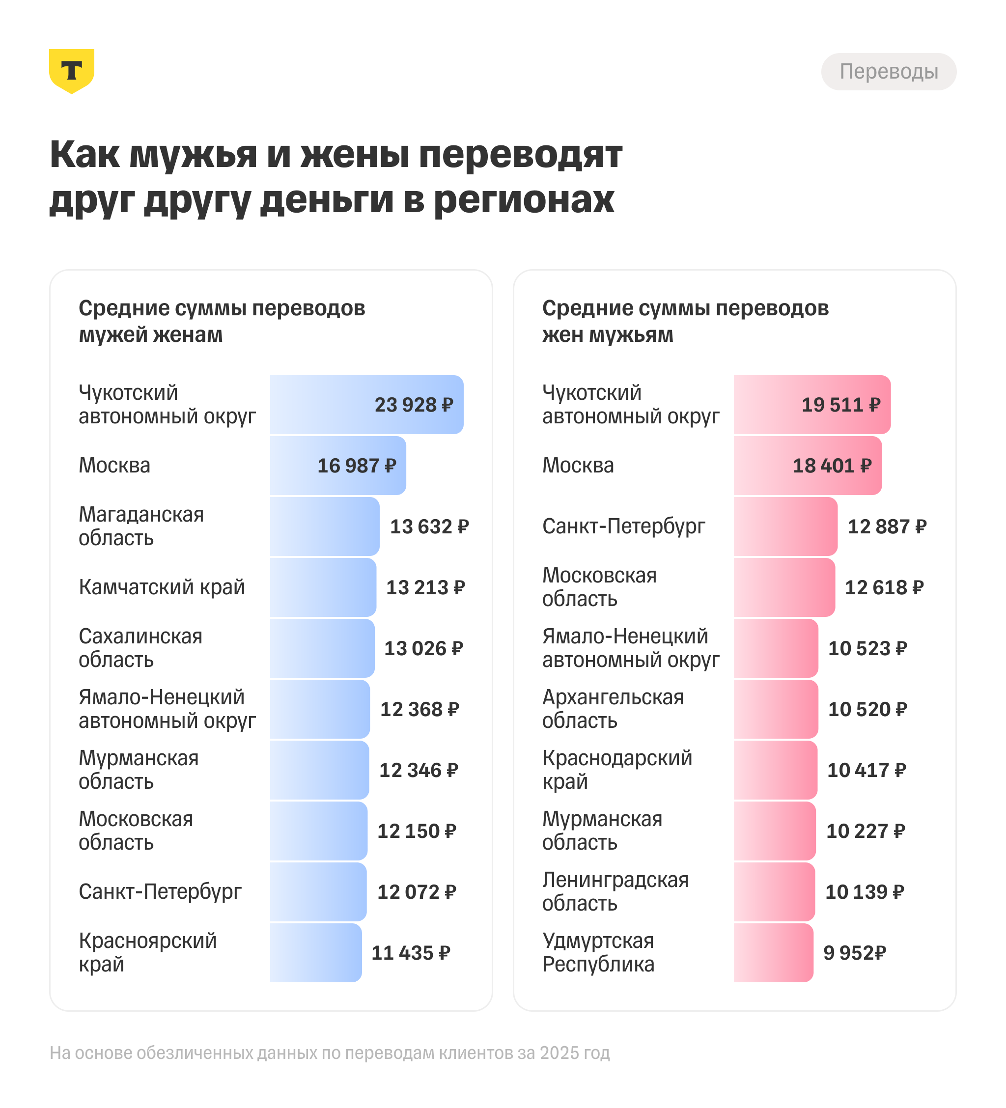 Среди всех регионов больше всего денег мужья и жены переводят друг другу в Чукотском автономном округе: средняя сумма перевода от мужа жене — 23 928 ₽, от жены мужу — 19 511 ₽. На втором месте Москва: от мужа жене — 16 987 ₽, от жены мужу — 18 401 ₽. По переводам мужей тройку замыкает Магаданская область (13 632 ₽), а по суммам от жен — Санкт-Петербург (12 887 ₽).