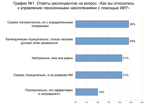 Отвечая на вопрос «Как вы относитесь к управлению пенсионными накоплениями с помощью ИИ?», из тех, кто был против, четверть опрошенных (24%) заявила, что относятся к такой идее скептически, еще 21% — категорически против такой возможности. И только каждый десятый участник исследования безоговорочно готов доверить ИИ управление своими финансами. Подробнее ответы представлены в Графике № 1.