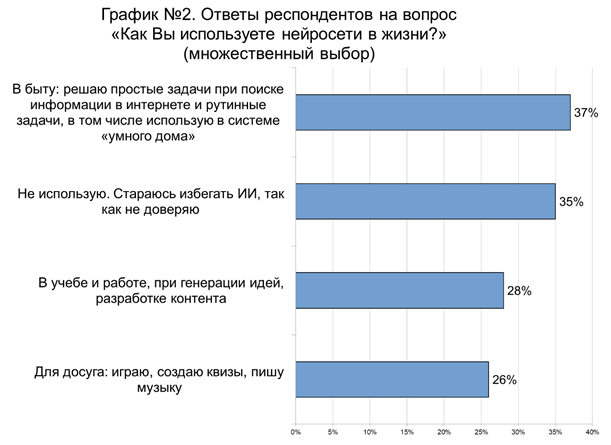 Несмотря на скепсис в отношении участия ИИ в решении финансовых вопросов, в быту россияне активно его используют. Об этом заявили 65% участников опроса. Так, 37% респондентов с помощью нейросетей ищут необходимую информацию в сети и решают рутинные задачи. Еще 28% обращаются к искусственному интеллекту для генерации идей, контента на работе и во время учебы. Почти столько же (26%) признались, что обращаются к нейросетям для души: пишут музыку, создают видео, делают игры. Подробнее — в Графике № 2.