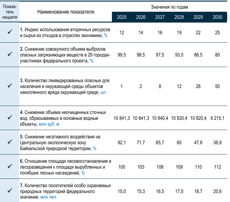 Национальный проект «Экологическое благополучие» представляет собой комплекс системных мер, направленных на обеспечение качества окружающей среды, необходимого для благоприятной жизни человека и устойчивого развития экономики. В рамках национального проекта с 2025 года реализуется шесть федеральных проектов, обеспечивающих достижение пяти показателей и задач национальной цели «Экологическое благополучие». Кроме этого, их реализация предусмотрена 14 федеральными органами исполнительной власти с отражением 18 уникальных показателей.