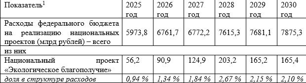 Показатели финансового обеспечения национального проекта «Экологическое благополучие» за счет средств федерального бюджета на период их действия свидетельствуют, с одной стороны, о незначительной доле в общей структуре расходов федерального бюджета, с другой – о тенденции к ежегодному их увеличению.