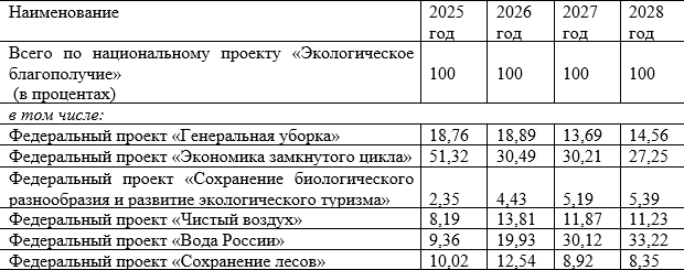 Параметры ресурсного обеспечения в разрезе федеральных проектов национального проекта «Экологическое благополучие» и их мероприятий (результатов) отражают изменение в долевом выражении в отдельные периоды. Более весомым в финансовом соотношении в 2025 году является федеральный проект «Экономика замкнутого цикла» со снижением до 30 % в последующие годы, а к примеру федеральный проект «Вода России» в долевом соотношении в общей структуре расходов федерального бюджета в рамках национального проекта «Экологическое благополучие» достигает более 30 % в плановых значениях к 2028 году.