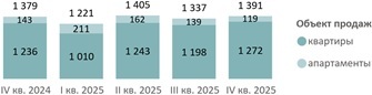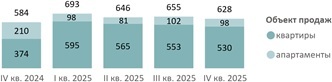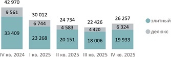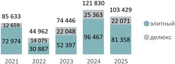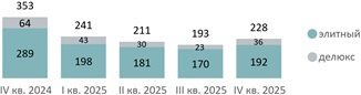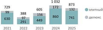 В 2025 году девелоперы высокобюджетной недвижимости реализовали по ДДУ 103,4 тыс. кв. м недвижимости (-15% за год), из них 81,4 тыс. кв. м элитного класса (-16%) и 22,1 тыс. кв. м – делюкс-класса (-13%). В IV квартале 2025 года по ДДУ было реализовано 26,3 тыс. кв. м недвижимости (+17% за квартал, -39% за год).