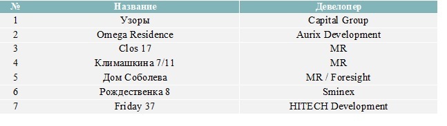 Проектные декларации на сайте наш.дом.рф / АО «СЗ «ГЕОПРИБОР» (Quartier d’Or) / «Золотой квартал»), ООО СЗ «ВРАЖСКИЙ» (Узоры), ООО «СЗ ФОТИЕВОЙ 5» (ЖК «Omega Residence»), ООО «СЗ «КСР» (Clos 17/ Кло 17), ООО «СЗ «К7/11» (Климашкина 7/11), ООО «СЗ «М2-ДЕВЕЛОПМЕНТ» (Дом Соболева), ООО «СЗ ГАЛС-КУЗНЕЦКИЙ МОСТ» (Рождественка 8), ООО СЗ ХАЙТЭК ПЯТНИЦКАЯ 37С2 (Friday Villas), ООО «СЗ «ГАЛС-ШЛЮЗОВАЯ» (Монблан), ООО «СЗ «ОПУС» (Клубный дом OPUS), АО «СЗ «БАДАЕВСКИЙ» (ЖК Бадаевский), АО «СЗ «ЭЛИТА-ЭКО» (ЖК D'ORO MILLE), АО ФСК «РУССКОЕ ЗОЛОТО-СТРОЙИНВЕСТ» (г. Москва, ул 1-я Тверская-Ямская, д. 2), ООО «СЗ ИЛЬИНКА 3/8» (Ильинка 3/8), ООО «СЗ Грандсоюзинвест» (МФК Коллекция Лужники (жилые корпуса)), ООО «СЗ «СМАЙНЭКС ОБЫДЕНСКИЙ №1» (Обыденский № 1), ООО «СЗ «ТОЛМАЧЕВСКИЙ» (Лаврушинский), ООО «СЗ АЛЬФА» (Фрунзенская набережная)