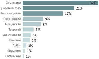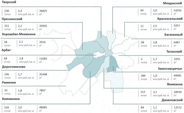 Максимальный объем предложения реализуется в районе Замоскворечье (364 лота). В Тверском районе отмечается максимальная средневзвешенная цена кв. м (3,3 млн руб.).