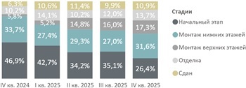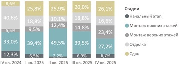 Как в элитном, так и делюкс-классах наблюдается смещение структуры предложения в сторону более поздних стадий строительной готовности. Это связано со снижением темпов вывода новых проектов: доля лотов на ранних этапах строительства сокращается, в то время как доля объектов на завершающих стадиях увеличивается.