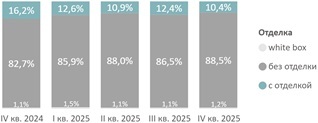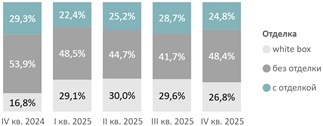 В распределении по типу отделки как в элитном (10,4%, -5,8 п. п.), так и в делюкс-классах (24,8%, -4,5 п. п.) отмечается сокращение доли предложения с чистовой отделкой. При этом в обоих сегментах основная доля предложения приходится на квартиры без отделки.