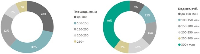 Распределение предложений на первичном рынке недвижимости высокобюджетных новостроек по площадям и бюджетам, количество лотов