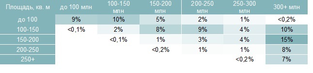 Распределение предложений на первичном рынке недвижимости высокобюджетных новостроек в зависимости от стоимости и площади