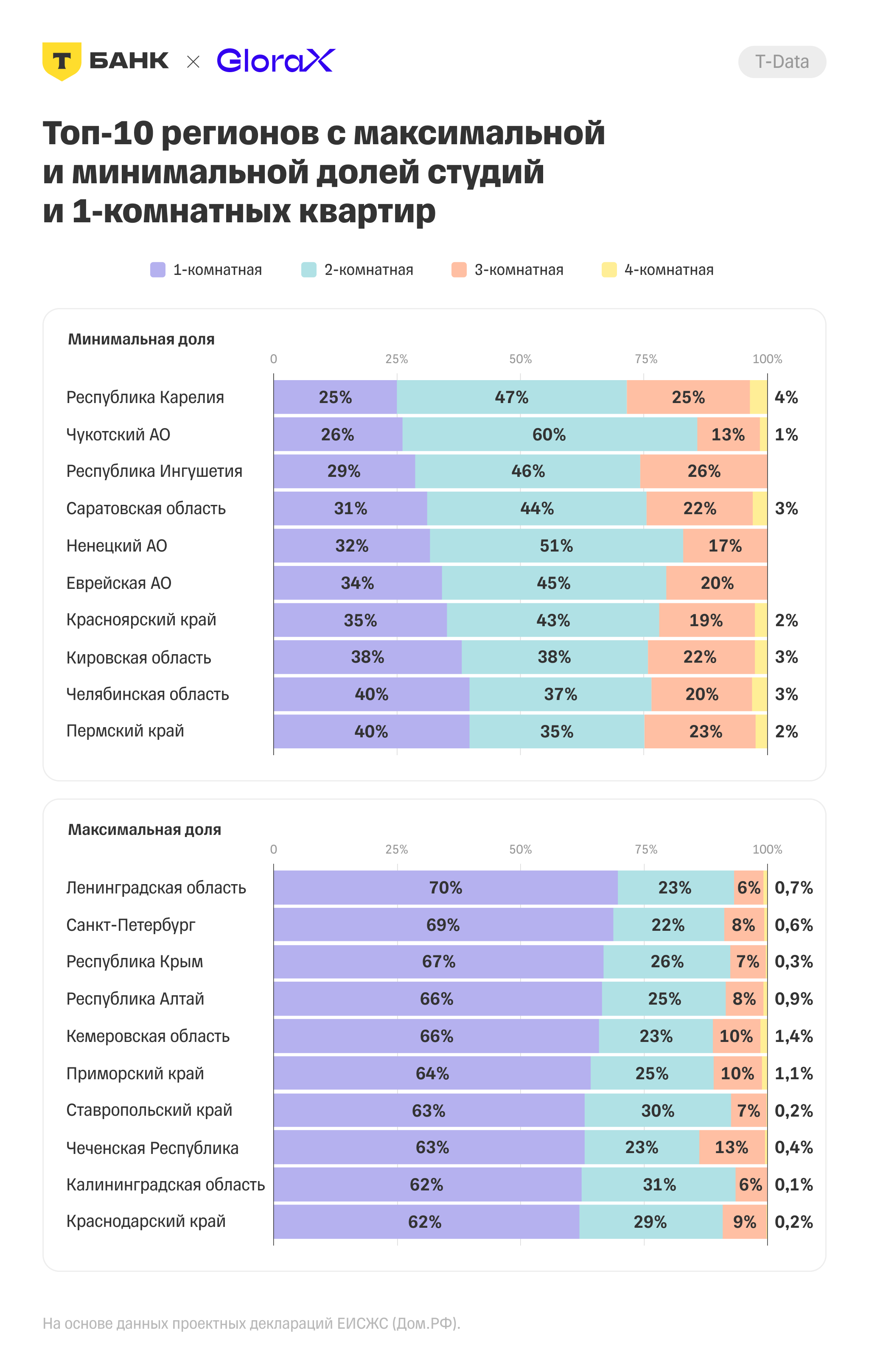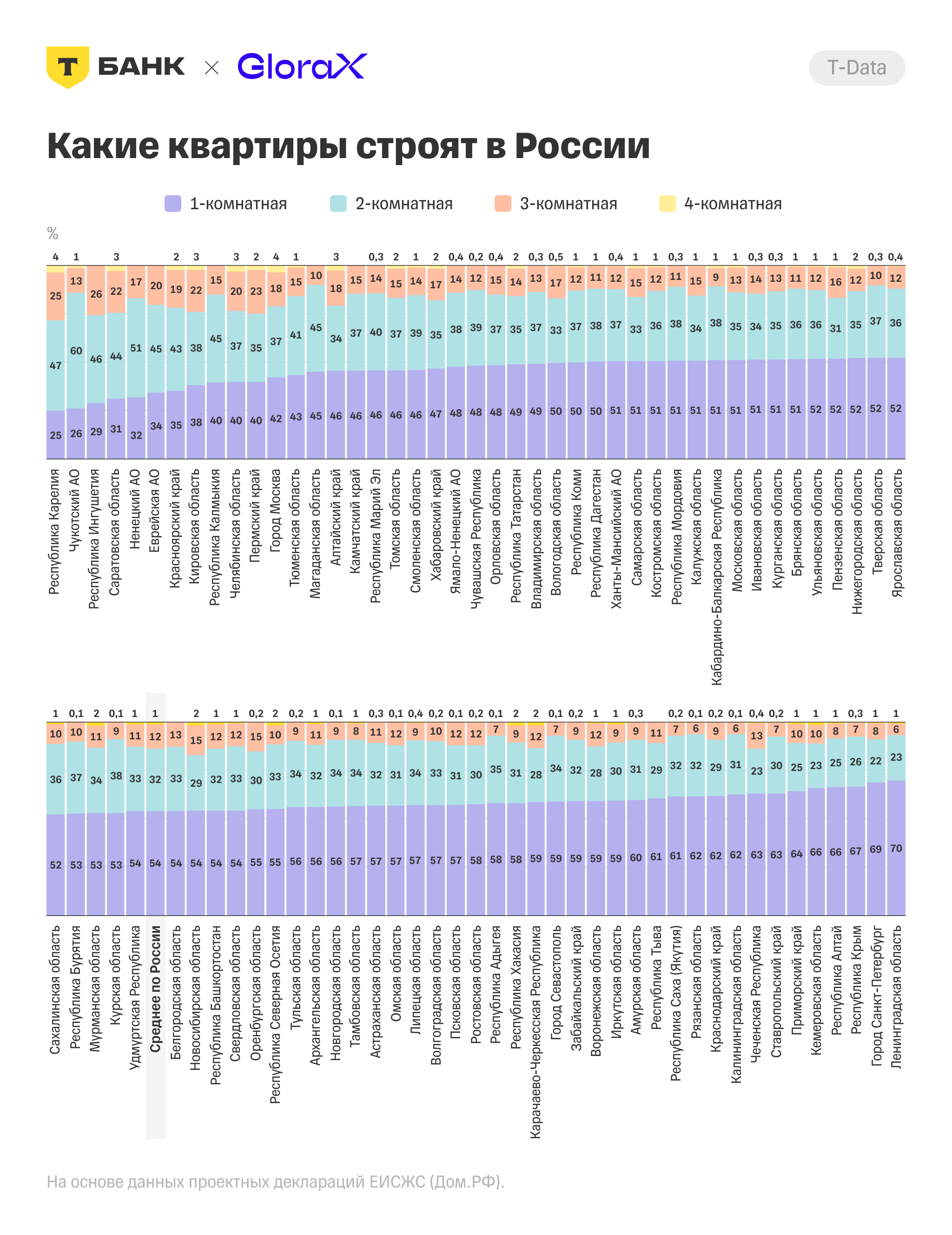 Максимальная доля 1-комнатного жилья и студий зафиксирована в Ленинградской области (70%) и Санкт-Петербурге (69%). Там же строят самые маленькие в стране квартиры — в среднем 41,4 и 42,1 м² соответственно.